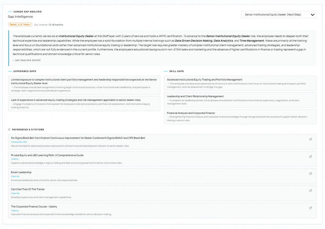 The Career Gap Analysis section provides a deep, AI-generated assessment of what an employee needs to transition into a specific target role.
