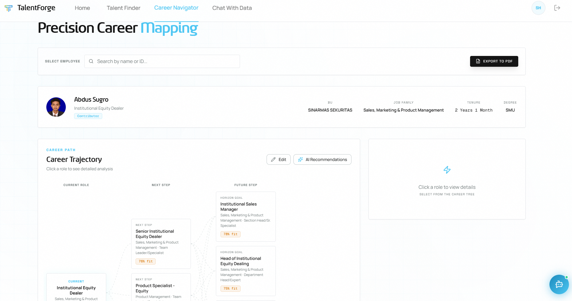 The career path graph is the centerpiece of the Career Navigator page. It maps out where an employee could realistically go next, based on their education, experience, and skills.