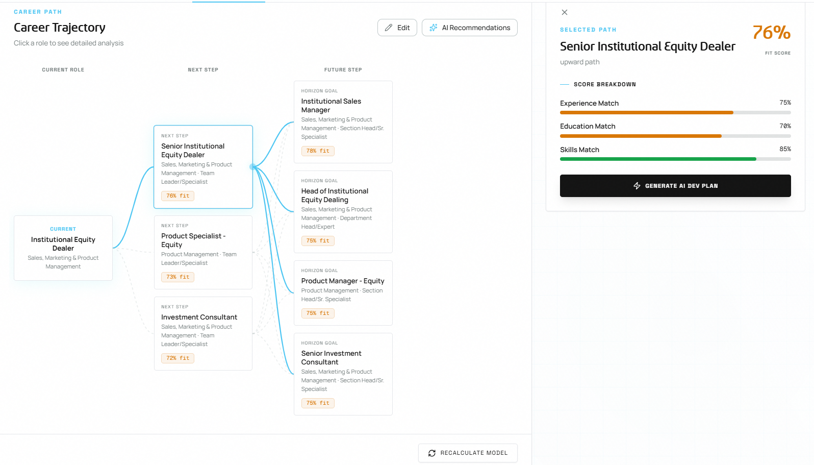 - Click "Recalculate Model" at the bottom of the graph to force the AI to regenerate the career tree (useful after profile updates, criticality tags, or new skills imports).
