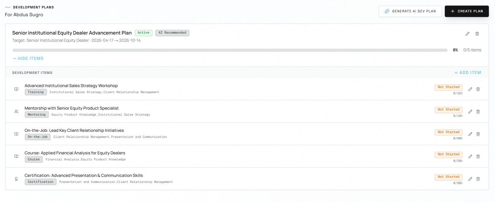 - Click "Generate AI Dev Plan" from the Role Detail panel or above the plan list.