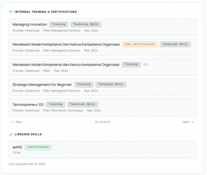 💡 Tip: Internal training records are a key input to the AI's Gap Analysis — the AI cross-references completed trainings against target role requirements.