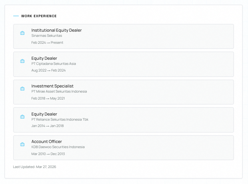- Date Range — formatted as "Jan 2020 → Aug 2022" (or "→ Present" for the current role)